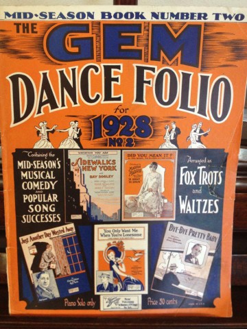 Of course, the art isn’t all on the outside.  There’s a lot to learn just by opening up one of these old gems and trying to play them. I’ve been working on a piano piece called “Leonora” found in The Gem Dance Folio for 1928, No 2 which is pictured above. It’s labeled a “Russian foxtrot.” (What’s a Russian foxtrot? Google tells me it’s a kind of Soviet submarine. There are hints it has something to do with Bolshevik jazz.) I can’t find a recording of it, even in the Library of Congress’ wonderful National Jukebox. It’s a haunting piece and almost too hard for me to play (again, I’m not so good.) Maybe it flows better with vodka. Maybe I’m just being sentimental over the sounds of a lost song, that may only ever be heard again when someone takes the time, like a nightingale, to sing forth.