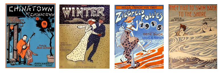 I thought about trying to recreate this experience by hiding my stereo remote, iPad and phone and making music on my piano ( which I can play somewhat) and my flute ( on which I am hopeless). But I kept getting distracted by the music that I was trying to play. I love old sheet music. It gives you access to the sounds of the past— the songs that were popular  in their time but that didn’t enter into the popular canon – and some specimens are works of art in their own right. Sheet music art was the album cover art of its day.  At a time when records were still packaged in plain brown wrappers and had bland labeling (no color on that little dog with his ear to the Victrola just yet), sheet music illustrations were bursting with color, new fonts and trendy graphics. Here are some that I love: